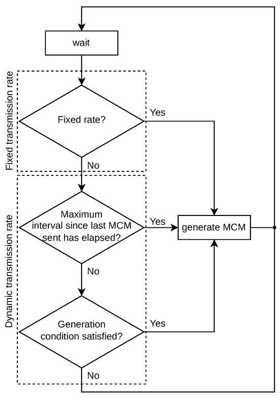 Rules for MCM generation are essential to balance traffic efficiency and safety with channel load, especially in situations that require vehicle cooperation. Figure 4 presents the proposed rules for MCM generation where two approaches are considered. In the fixed transmission rate approach, MCMs are generated and transmitted at a consistent frequency of 10 Hz (configurable). In the dynamic transmission rate approach, the generation and transmission of MCMs varies depending on the vehicle’s operational state. A maximum (10 Hz, configurable) and a minimum (1 Hz, also configurable) transmission rate have been established.