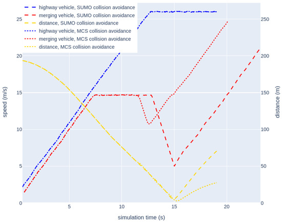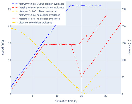 The default SUMO collision avoidance simulation represents the standard vehicle driving behavior that does not rely on V2X communications for collision avoidance. Figure 5 illustrates the behavior of the vehicles in this simulation by analyzing only the dashed lines. The blue dashed line corresponds to the speed of the highway vehicle, while the red dashed line represents the merging vehicle. The yellow dashed line depicts the measured distance between the two vehicles throughout the simulation. The graph shows the merging vehicle (red dashed line) braking on the ramp (simulation time ≈ 13 s) when it detects a possible future collision. In the simulation without collision avoidance, the default SUMO collision avoidance system was intentionally disabled to induce a collision between the vehicles in the scenario. SUMO generates a warning to indicate whether a collision has occurred. Figure 5 also shows the equivalent analysis for this situation by examining the dotted lines. In this case, the vehicle on the ramp (red dotted line) does not break to avoid the collision. However, SUMO automatically performs a small emergency brake at the collision moment (simulation time ≈ 16 s).