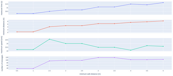 To test the MCM-based system in the different approaches, default values were initially set for all parameters. These values were chosen to ensure traffic safety in the specified simulation scenario. After that, each parameter was individually varied, while the others were kept at the default value. This made it possible to analyze the impact of each individual parameter on the selected metrics and draw conclusions about efficiency, safety, and channel load. For example, Figure 6 shows the impact of the minimum safe distance parameter on the selected metrics using route-based trajectories with dynamic transmission rate. The values were optimized for each approach through an experimental analysis (trial and error) in order to achieve improved parameter configuration. Table 3 presents the default and optimized values of all parameters for the two different approaches. In the example, Figure 6 shows that the optimal minimum safe distance is attained at 1.5 m (below that there is a collision), while all other parameters are kept at the default values. However, when trying to simultaneously optimize all parameters, the minimum safe distance was better set at 2.5 m in order to still guarantee traffic safety in the scenario.