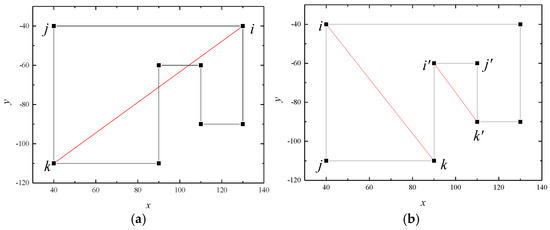For concave polygons, if only the Delaunay triangulation algorithm or the sequential successive method is used, it will result in wrong sectioning results. In Figure 2a, simply connecting points i, j, and k will result in the mesh containing non-polygonal parts; as shown in Figure 2b, is the correct triangular patch, while is located in the outside of the polygon, which is the wrong triangular patch. Therefore, the following two conditions are required to form the correct triangular patch: the currently formed triangular patch does not contain any other point inside; if the polygons are sorted counterclockwise, the modulus length of the vector product of the vectors and of the currently formed triangle is greater than 0 (or the modulus of the product of the vectors is less than 0 if the polygons are sorted clockwise).