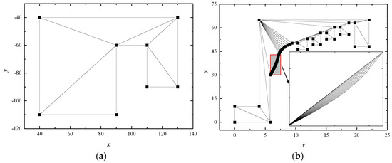 A typical convex polygon is selected and the vertex data of the model are obtained clockwise or counterclockwise, and the geometric model of the model is shown in Figure 1a. The result of triangular meshes using the Delaunay triangulation algorithm for this model is shown in Figure 1b, which shows that the convex polygon is divided into four triangular meshes.