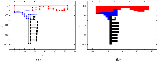 Based on the above algorithm, FDTD models can be established for any horn cross-section model. To verify the correctness of this algorithm, the established BOR–FDTD mesh computational models for both single-medium and multi-medium scenarios are presented. Figure 6 and Figure 7 show the geometric models and BOR–FDTD computational mesh models of different horns, where the different colors represent the different media. The results indicate that the optimized modeling method can handle the triangular mesh of arbitrarily complex polygonal shapes and the establishment of BOR–FDTD computational models.