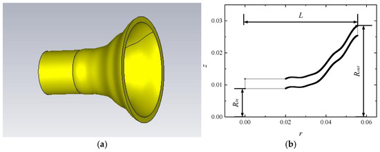 The 3D model and cross-sectional model of a typical smooth-walled horn antenna is shown in Figure 8, with an overall length of the horn , radius of the horn inlet , radius of the horn outlet , and wall thickness . The feed mode is mode.