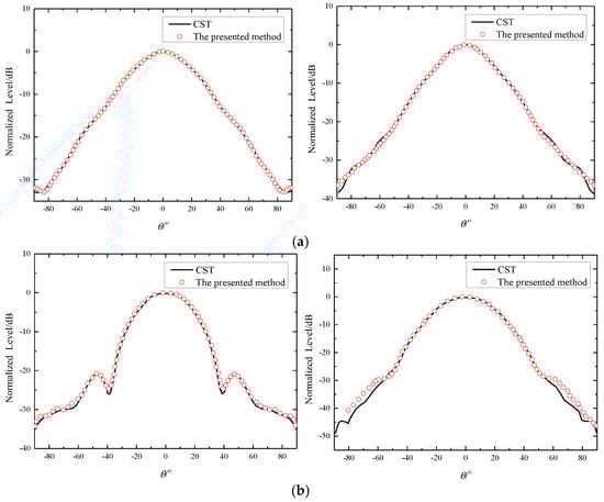 As shown in Figure 9, the radiation patterns obtained from the presented method and the commercial software CST at two different frequencies demonstrate that as the frequency increases, the main lobe width decreases, while the number of side lobes increases. This indicates that the simulation results from the BOR−FDTD method align closely with those from CST, thus validating the correctness of the proposed algorithm. Additionally, in terms of computational efficiency, the BOR−FDTD method shows a significant advantage. According to Table 2, the calculation time consumed by the proposed method is approximately 32% of the simulation time of CST, resulting in a substantial reduction in computation time.