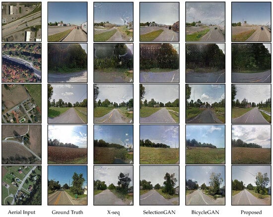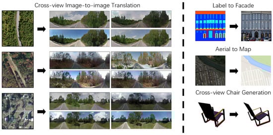 Cross-view image-to-image translation refers to generating what the scenery looks like from two different views at the same location, which involves both semantic and appearance translation simultaneously. This task is important for a variety of applications, including scene (place) inspection [1,2,3], aerial view surveillance [4,5,6,7], and autonomous navigation, which can be widely used in the military, agriculture, smart cities, and other fields. For example, military personnel can use unmanned aerial vehicles (UAVs) to collect aerial images and realize intelligence generation and reconnaissance tasks through cross-view image translation, providing important support for military operational planning and military decision making. Therefore, it has been gaining increasing attention recently [8,9,10,11,12]. As shown in Figure 1, the task of cross-view image-to-image translation is more challenging than existing image translation tasks [13,14,15,16,17,18]. This is caused by the massive gap in terms of semantic structure and appearance difference between two drastically different views. Earlier works mainly consider two cases [9,19,20], where either two largely overlapped views of the scenery, such as label to facade and aerial to map, or only a given object of different view angles, such as a chair or a table, are required to be synthesized. However, these works can hardly handle the case where two views are far away from each other.
