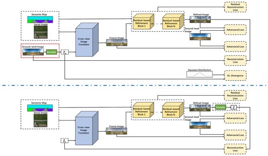 Specifically, we constructed a Kullback–Leibler divergence-based autoencoder [51] to map the ground truth image corresponding to the aerial image to a low-dimensional vector, and generate a latent code that follows a Gaussian distribution. The U-net-based cross-view image translator, denoted as , generates the coarse panorama from the ground-level semantic map, aerial image, and . Subsequently, multiple cascaded residual-based refinement blocks progressively optimized the coarse panorama to generate the refined panorama. The i-th cascaded residual-based estimation block in the following network is denoted as , of which the refined panorama output is defined as . The final output is denoted by . Finally, the overall loss function was constructed to train the network, including multi-stage adversarial loss and image-level reconstruction loss for the cascaded residual-based refinement networks, as well as divergence constraint and latent-code-level reconstruction loss for the encoder. During the testing phase, the ground truth panorama is not available. We randomly sampled latent code by encoding the generated panorama to the same distribution of the latent code . The aerial image, ground-level semantic map, and latent code were input to synthesize the refined image through the cross-view image translator and cascaded residual-based refinement blocks. The following subsections will provide more details of the proposed CRP-GAN.