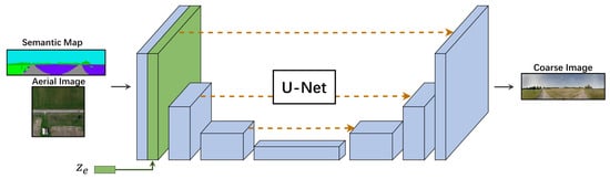 (1) Aerial Image to Ground-level Panorama. As mentioned before, translating an aerial-view image to ground-level panorama is more challenging than traditional image translation tasks due to the significant cross-view semantic and appearance difference. Therefore, as shown in Figure 2, we propose to synthesize a ground-level panorama which contains richer information from the aerial image in a progressive refinement manner, rather than straightforwardly performing the cross-view image-to-image translation in a single step. As shown in Figure 3, the U-net [52] was firstly selected as the backbone cross-view generator to synthesize a coarse ground-level panorama. Besides the aerial image, we also adopted a panorama semantic map that had an expanded field-of-view as conditional guidance, to alleviate the problem of semantic ambiguity in the process of viewpoint transformation. In particular, the aerial image was first resized to concatenate with the semantic map of 256 × 1024 resolution and the latent code for diversified generation purposes. The concatenated input was then fed into the cross-view generator, with the output denoted by , where represents the coarse panorama, represents the cross-view generator, represents the aerial image, represents the panorama semantic map, and is the encoded latent code.