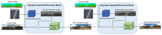 (2) Cascaded Progressive Refinement. The residual-based refinement network is able to synthesize panoramas with less blurs and artifacts under most circumstances. Based on our observations, our CRP-GAN, similar to other GAN networks, tended to generate a large chunk of blurs within a particular semantic area at the early stage of the network. On the other hand, our residual estimation network estimated tons of images of variant quality. So, we propose to study such an appearance translation task in a progressive manner. Specifically, multiple residual estimation blocks are cascaded one after another to take full advantage of residual estimation capacity. As the number of cascaded blocks rises, panoramas of better quality will be synthesized and smaller residuals will be predicted. The residual maps tend to gradually focus on the small details and tiny artifacts of the images. As is shown in Figure 4, progressive refinement is achieved by cascading multiple residual-based refinement blocks. To make sure the refined images always share the same semantic structure as the previous coarse image, the original semantic map and the aerial image are concatenated with the refined output from the preceding block as input for the subsequent stage of refinement. The i-th stage refined panorama is defined as