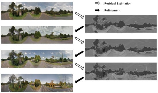 where and denote the refined panorama output of the -th and i-th blocks, and represents the i-th cascaded refinement block. Figure 5 presents the intermediate generated panoramas of the progressive refinement strategy. The left side shows the refinement effects at each stage, while the right side displays the residual maps generated by the residual estimation network. As the refinement process progresses, the residual maps become progressively finer, with significant reductions in details and artifacts. These residual maps accurately highlight the discrepancies between the generated panoramas and the ground truth, helping us make targeted corrections in specific areas of the image.