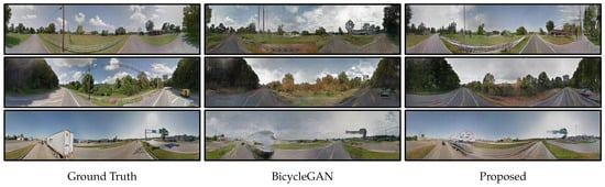 Furthermore, to validate the effectiveness of our proposed CRP-GAN for generating ground-level panoramas which possess a wide field of view, we select BicycleGAN for comparison and train it on CVUSA dataset for panorama generation. Figure 8 shows results generated by our method and BicycleGAN. It can be seen that our method consistently retains more realistic details even with wide field of view. When generating ground-level images, BicycleGAN leads to considerable road deformations and edge blurring, while our method preserves better road structure and provides more accurate objects, such as railings.
