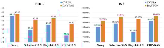 In this subsection, we evaluate the quantitative results of our CRP-GAN model in comparison with X-seq [11], SelectionGAN [12], and BicycleGAN [46] on Dayton and CVUSA datasets. The FID, Inception Score (IS), PSNR, SSIM, and SD as described before are used as evaluation metrics. The quantitative results of all methods are presented in Table 2 and Table 3 and Figure 9.