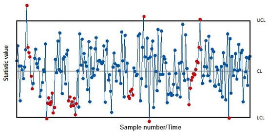 In practice, the decision about process stability based on the charts is made by the operator. The observation of the chart is reduced to the observation of a characteristic pattern of points, which is a signal that the process is losing stability. These patterns are a ‘picture’ of the process state. In process control, they are often called symptoms. It is the task of the quality engineer, the process engineer, or another person responsible for the process to indicate which point patterns for the process are symptoms of instability. The engineer also defines the possible corrective actions to be taken when the process is unstable. Such signals can be points outside the control lines, an increasing trend, clusters of points in one area, cycles, and many others (Figure 2, red points) [13,15].