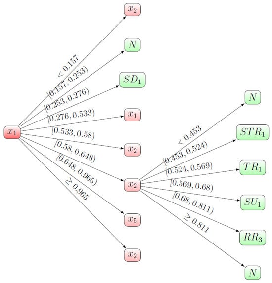 The abbreviated structure of the decision tree for the parameter set D11 is presented in Figure 4.