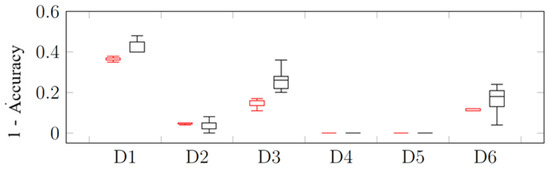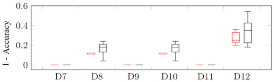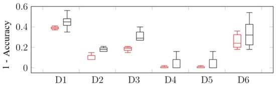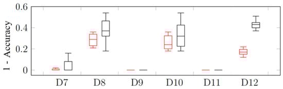 The obtained results are visualized as box plots. The red plots correspond to the results obtained by the re-substitution method, whereas the black plots refer to using the ten-fold cross-validation procedure. In re-substitution, the validity of the model is checked on the same dataset that was used to train the model. Figure 5 and Figure 6 show the results for the Z5 dataset and the tested parameters (Di) of the decision trees. The results for the Z10 dataset are shown in Figure 7 and Figure 8, respectively.