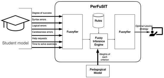 PerFuSIT is an innovative fuzzy-based mechanism for providing personalized tutoring strategies in an intelligent tutoring system that teaches computer programming (Figure 2). In more detail, PerFuSIT takes as inputs the student’s degree of success in the knowledge domain, the percentage of syntax and logical errors s/he makes, the frequency of mistakes that happen due to carelessness, the frequency of help requests, and the time s/he needs to solve exercises. These data are provided by the student model. Also, PerFuSIT takes as inputs the weights of each criterion. The weights are stored in the pedagogical model and are defined by tutors and experts in computer programming. The input data are fuzzified, and PerFuSIT applies weights and a set of fuzzy rules over them to recommend the most appropriate tutoring strategy among the five available, ranging from reviewing a chapter or moving on to the next one to providing supplemental content and additional exercises or rest.