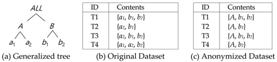 Data privacy models such as k-anonymity [1], l-diversity [2], and t-closeness [3] have been proposed for structured data anonymization. These models have been well documented in international standards such as ISO/IEC 20889 [4,5]. Significant research efforts have been made regarding the anonymization of set-valued microtransaction data, as summarized in Table 1 below.