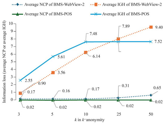 Experiments using the BMS-WebView-2 and BMS-POS datasets showed that the IGH-based LGR+ algorithm tended to cause greater information loss than the NCP-based algorithm. IGH allows for a more precise evaluation of information loss by assessing data uncertainty through entropy, thereby enhancing privacy protection. For example, on the BMS-POS dataset with k = 3, IGH recorded approximately 100 times more information loss than NCP, indicating a higher level of privacy protection. Conversely, NCP maintained lower information loss and preserved data utility better.