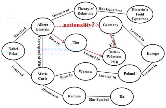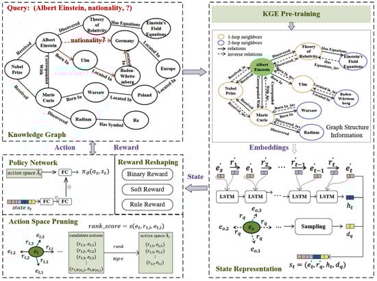 Traditional KGR methods, particularly embedding-based and rule-based methods, have limitations in dealing with noisy or incomplete data and capturing the potential complexity of real-world knowledge. Multi-hop KGR [,,] is an important KGR technique used to discover complex and multi-level relations between entities in a KG to infer hidden information. Numerous reinforcement learning (RL)-based methods for multi-hop reasoning have emerged recently. Reinforcement methods were first employed to learn reasoning paths in KGs in DeepPath [], where path finding is treated as a Markov decision process (MDP) and a sophisticated reward function is employed in which accuracy, efficiency, and path diversity are considered simultaneously. This approach provides enhanced control over the path finding process. DeepPath was followed by series of other techniques such as MINERVA [], AttenPath [], Reasoning Like Human (RLH) [], DAPath [], etc. These techniques offer high efficacy and the valuable characteristic of providing interpretable reasoning paths for KGR. For example, as shown in Figure 1, given a query (Albert Einstein, Nationality, ?), these methods can provide a chain of evidence to draw the conclusion (Albert Einstein, Nationality, Germany), e.g., Albert Einstein  Ulm  Baden-Württemberg  Germany.