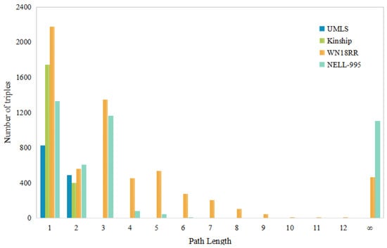 To determine the optimal number of hops for multi-hop reasoning, we conducted a statistical analysis of the dataset. Specifically, we utilized the triples in the training dataset to construct a graph and then analyzed the triples in the validation and test datasets. We employed the Breadth-First Search (BFS) algorithm to identify the shortest paths between the head and tail entities and recorded the distribution of the path lengths. Figure 3 shows the distribution of the shortest path lengths in the four datasets. The symbol ∞ indicates that there is no path between the head and tail entities, which means that they are unreachable from one another. As shown in Figure 3, the entities in the UMLS and Kinship datasets can be obtained within two hops, while most of entities in the WN18RR and NELL-995 datasets can be found within three hops. However, some entities in the WN18RR and NELL-995 datasets are unreachable. Therefore, the maximum reasoning hop was set to two for the UMLS and Kinship datasets and three for WN18RR and NELL-995. The values for PMHR in Table 2 were obtained as the averages of the results for three runs.