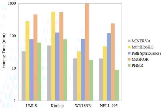 The training time efficiency of our proposed method PMHR was compared against four baseline models (MINERVA [], MultiHopKG [], MetaKGR [], and Path Spuriousness []) across four datasets (UMLS, Kinship, WN18RR, and NELL-995). Training time refers to the time required for training the RL agent, excluding the pretraining time for knowledge graph embeddings, which is shared by MultiHopKG [], MetaKGR [], Path Spuriousness [], and PMHR. MINERVA [] does not include the pretraining process for knowledge graph embedding, which results in a shorter overall running time. Since our analysis focuses on the training efficiency of the RL agent, the pretraining time is excluded for all models. In Figure 4, the horizontal axis represents the datasets while the vertical axis shows the training time in minutes. Due to the significant differences in training time across datasets, we use a logarithmic scale of base 10 for the vertical axis to better visualize the results.