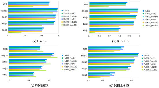 The results shown in Figure 5 show that removing any component of the model reduced its effectiveness in most cases. This demonstrates that all parts contribute to the overall performance. Specifically,  is a pure RL method without enhancement. It utilizes the randomly initialized vectors instead of vectors learned by KG representation learning. Consequently,  achieved the worst performance on the UMLS, Kinship, and NELL-995 datasets. An interesting finding is that on the WN18RR dataset,  achieved the best performance, which exceeds those of the various variant models, PMHR, and even the SOTA ConvE [] and DisMult [] models. Under the  method, Hit@1 is 0.435, 0.542 for Hit@10, and 0.472 for MRR, which are better than those of the SOTA models. This is because the reward function is a crucial factor that affects the effectiveness of RL. It directly influences the behavior and decision making process of the agent during the learning process. As shown in Table 2, while the KG representation learning models performed well on other datasets with MRR values above 0.75, their performance on the WN18RR dataset was comparatively poor, with MRR values below 0.5. Thus, representation learning helped mitigate reward sparsity and provided positive guidance on the UMLS, Kinship, and NELL-995 datasets, whereas it interfered with the RL process on the WN18RR dataset. This interference occurred because a high positive reward (close to 1) was assigned to some paths that did not reach the target entity. Consequently, directly using the obtained representations did not have a positive impact on the RL environment and rewards.  uses ConvE for KGR and soft rewards. The use of soft rewards helped alleviate the sparse rewards problem in RL and resulted in noticeable improvements on most datasets. A comparison between PMHR and  shows that the graph structure information helped enrich the state representations. Graph structures offer natural representations of the complex relations between entities. The explicit modeling of these structures allowed the complex interactions within the environment to be captured, thereby enhancing the state representation. A comparison between PMHR and  shows that query-related guiding information allowed the agent to make correct choices and improved model performance. A comparison between PMHR and  shows that adding rule-based rewards improved the model. The agent was further constrained by the rules to find more reasonable paths that lead to the target entity and conform to the rules when it encountered spurious paths that led to the target entity but were unrelated to the query.