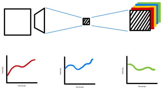 HSI creates a 3D dimensional cube defining a scene with one spectral dimension and two spatial dimensions, commonly expressed in a stacked layer fashion. Each pixel has their own unique spectrum, which is also named the spectral fingerprint [,,]. It is this data richness that makes spectral information useful, but also what adds to its complexity and therefore challenges [].