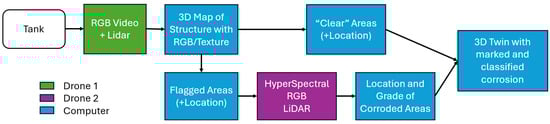 The proposed approach (Figure 4) would be to have an initial flight scan the structure with visual and LiDAR sensors to map the structure and find evident abnormalities in it. These flagged areas will then be closely identified and graded using hyperspectral sensing techniques. LiDAR and visual information is crucial for mapping the tanks and creating a base on which to process the additional features that might arise from the use of additional sensors.