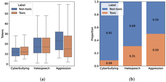 In this section, we conducted a brief exploratory analysis to summarise and visualise the key characteristics of the three described datasets. We used a popular NLP toolkit spaCy (specifically, we use the Polish pl_core_news_lg model: https://spacy.io/models/pl#pl_core_news_lg (accessed on 1 December 2024)) with its word-level tokeniser to compute the utterances’ length distribution (measured in tokens) for each dataset. Figure 1a displays box plots of the distributions, additionally grouped by class label. For brevity in this section, we refer to the harmful/hateful/aggressive labels as toxic and to the non-harmful/non-hateful/non-aggressive labels as non-toxic. We note that the length distributions for toxic and non-toxic categories in the Aggression dataset exhibit slight differences. This discrepancy is likely due to the preprocessing method outlined in the previous section. Although this variation in distribution is not ideal, we opted to retain the straightforward stochastic procedure that we described rather than implementing a more complex process to achieve perfectly matching distributions.