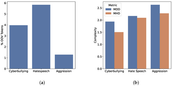In addition to examining the basic properties, we calculated several metrics to assess the quality and complexity of the textual data. Figure 2a displays the percentage of out-of-vocabulary (OOV) tokens in each dataset (computed using spaCy toolkit). A high number of OOV tokens may suggest the presence of numerous neologisms, typographical errors, or other language inaccuracies. As anticipated, the Aggression dataset, which features parliamentary language, contains only slightly more than 1% OOV tokens, indicating its high quality.