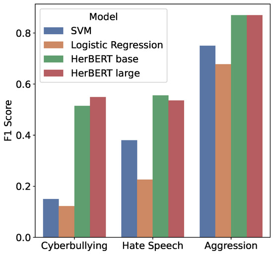 For In-dataset experiments, we first compared the trained HerBERT models (in their Cross-Entropy loss variant) to simpler and more interpretable baseline methods, namely, SVM and Logistic Regression. We used implementations from the scikit-learn (https://scikit-learn.org/ (accessed on 1 December 2024)) library. We conducted a small hyperparameter search using the validation splits and found that, for SVM, using the linear kernel instead of the default rbf improves performance. Similarly, in Logistic Regression, we selected the l1 penalty (and supporting it liblinear solver) instead of the default l2. We left the other hyperparameters unchanged. We first converted the utterances into TF-IDF vectors as a preprocessing step for SVM and Logistic Regression. Table 4 compares the baseline approaches and the HerBERT models for each dataset. The results are also visualised in Figure 3. The discrepancy between the metrics confirms that basic baseline approaches are insufficient to detect linguistic aggression in textual data and that more complex models, like HerBERT, are needed.