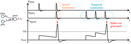 Spike generation at a post-synaptic neuron from two pre-synaptic neurons with leaky behavior, that is, a slow decrease over time of the membrane potential Vpre0, Vpre1, or Vpost, towards its rest potential Vrest. Upon reaching some threshold potential Vth, the membrane generates a spike resulting from the continuous spatial and temporal integration of pre-synaptic spikes.