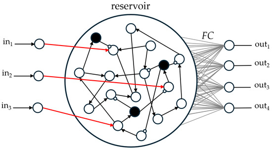 Architecture of LSM reservoir networks, with input and output layers of 3 and 4 neurons, respectively. Neurons chosen as inhibitory are shown as black disks. Excitatory and inhibitory connections are schematized as triangular and white-filled dot arrows, respectively.