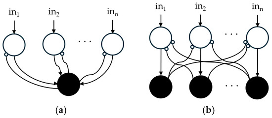 Spiking network architectures also evolved by taking direct inspiration from neurological observations, including several common deep learning topologies such as recurrent and convolutional networks that were initially bioinspired. Stronger plausibility is naturally observed in SNNs that use the asynchronous processing and temporality of spikes. Liquid-state machines (LSM) [25] or winner-take-all (WTA) layers [26] found in the literature, for example, were first studied from a biological perspective and then used in artificial intelligence. LSM, a method of reservoir computing shown in Figure 2, takes advantage of the excitation and inhibition dynamics of synapses by creating random connections in a population of neurons to produce complex spiking patterns, which can be further enhanced by adding delay-lines or connecting populations with different dynamics. Relying on lateral inhibition, WTA is also vastly used to limit spiking activity or for decision making by creating single neuron activations. Two possible architectures are depicted in Figure 3a,b, where inhibition is performed by one global neuron or with the same number of neurons as the layer receiving inhibition.