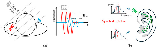 The bilateral arrangement of sound collectors is a common trait of vertebrates, with some variations involving the use of other vibration sensors in insects, arachnids, or marine animals. The use of paired sound collectors is essential for sound localization and general perception of a soundscape [29]. The difference in waveforms received at the two collectors of a binaural pair results in major interaural cues [30]. Among them, the most used are described below.