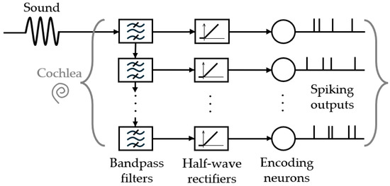 Several cochlea models were described with mathematical formalism, such as Lyon’s model [32] or Zilany’s model [33], and neuromorphic artificial cochleae were introduced, such as AEREAR(2) [34,35] and NAS [36,37]. A reproduction of the processing in the cochlea is commonly performed following Lyon’s model, which can be simplified as a bank of cascading band-pass filters (or parallel like in [38]), half-wave rectification, and suited spike encoding, as schematized in Figure 5.