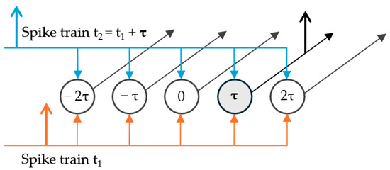 The MSO extracts ITDs by means of delay-lines and coincidence detections. A simplified model of the MSO was introduced by Jeffress [39], which is represented in Figure 6. Delay-lines propagating spikes issued from the two ears are connected to a population of neurons, such that only one neuron activates for a given ITD. They are considered coincidence detectors because a spike is generated only when they receive simultaneous excitation from both ears. Each coincidence detection neuron is tuned for a specific ITD.