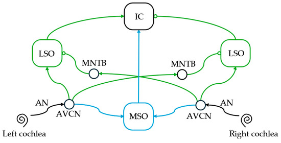 The main contributors for the extraction of sound localization cues are located in the superior olivary complex neuron population. It can be decomposed into the medial superior olive (MSO) and the lateral superior olive (LSO), which both contribute to identifying the direction of arrival of sound sources at different frequency ranges [28].