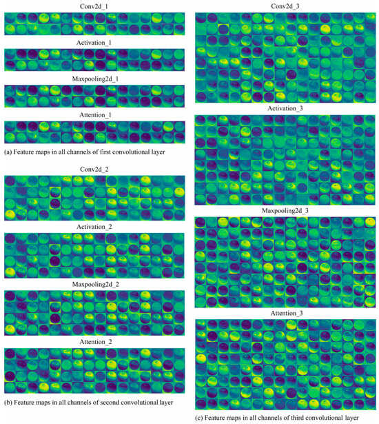 Feature maps in model. (a) Feature maps in all channels of first convolutional layer. (b) Feature maps in all channels of second convolutional layer. (c) Feature maps in all channels of third convolutional layer.