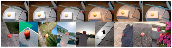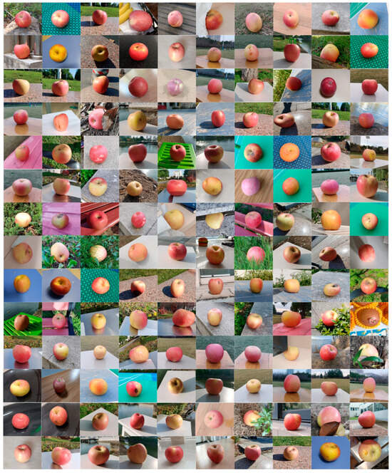 This study selects 450 apples, including 200 normal fruits and 250 defective fruits. To enhance the model’s practical scalability and generalizability, we deliberately captured images under diverse conditions, including indoor and outdoor settings, various weather conditions, different times of day, a range of background platforms, multiple angles, and varying shadow effects. The images were taken using a Redmi Note 10 Pro smartphone, resulting in a total of 2100 images, evenly divided into 1050 images of normal apples and 1050 images of defective apples. Some examples of the diverse shooting environments are illustrated in Figure 3.