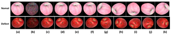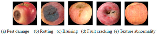 The defective apples include five types: (a) pest damage, (b) rotting, (c) bruising, (d) fruit cracking, (e) texture abnormality.