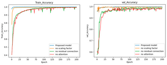To further validate the impact of different modules (scaling factor, residual connection, and attention layer) on the overall model, we use the complete model as the baseline and conduct comparative experiments with variants that remove the scaling factor, residual connection, and attention layer, respectively. Figure 6 shows the accuracy of the four different models on the training and validation sets.