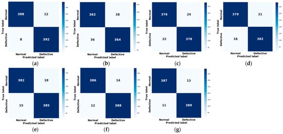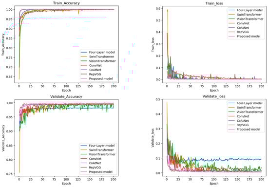 The experiments compare the proposed model with the Four-Layer model, Vision Transformer, Swin Transformer, ConvNet, CoAtNet, and RepVGG (referred to as the other six models in the following context), focusing on accuracy and efficiency. As shown in Figure 7, the training and validation accuracy results highlight key differences among these models. The proposed model shows a rapid increase in both metrics during the first 10 iterations, without the fluctuations seen in other models. After 140 iterations, the training accuracy of the proposed model stabilizes at 100%, while the validation accuracy reaches 99.9%. The validation accuracy of the other six models is 98%, 98.5%, 99.6%, 99.4%, 99.6%, and 99.5%, respectively. The training loss of the proposed model drops sharply in the first 10 iterations and stabilizes around 0.001 after the 20th iteration. The validation loss decreases rapidly in the first 25 iterations, then stabilizes around 0.001 after 75 iterations. In comparison, the validation losses of the other six models stabilize around 0.09, 0.02, 0.01, 0.009, 0.01, and 0.011, respectively. In contrast, the proposed model achieves the highest validation accuracy and the lowest validation loss.