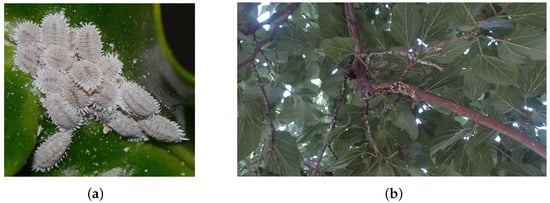 Planococcus citri (Cotonet). (a) The adult Cotonet pest. This image was captured with a digital camera as a microscopic-scale view. (b) Panoramic view of the experimental tree, where a concentration of the white Cotonet pest can be seen in the center of the image, specifically on the tree’s stems. This pest represents our object of detection.