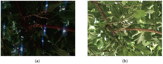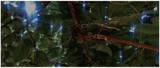 On the other hand, the Turia Garden, in the city of Valencia, Spain, serves as a working space for image detection. This location has the specific characteristics necessary to recognize the object of interest (pest). It is an environment of citrus trees in which a high level of heat and humidity can be appreciated and in which the pest is present. This pest has a white color and differs from the other elements of the trees (see Figure 2).