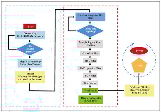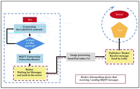 The working procedure of the system communications block can be seen in Figure 9. The code starts with the search and connects to a LoRaWAN network by the end node until it finds a LoRaWAN gateway that registers it. It then links Machine-to-Machine (M2M) communication [55,56] from the subscriber to the Broker over Wi-Fi. The Broker goes to a state of waiting for messages from the Publisher, then goes to image analysis and extraction of important information that represents the whole process to finally send this information to the Broker, which was waiting. This, in turn, transmits it through the LoRaWAN to a server in the cloud. So the user can see the data in the application.