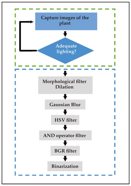 Finally, color segmentation in RGB space is applied since OpenCV is applied first to the blue channel, which is not commonly used in RGB. The range of values to be filtered is completed using the Paint image viewer (version 11.2408.30.0), indicating the position of the pixels to be found; based on that position, RGB value query commands are executed in the Python framework inside the Raspberry Pi to find the set of unwanted values. From these values, a coherent range of values is selected, where minimum and maximum values are assigned to the filter values in the code, which represent the values in the RGB space of the stem; in this way, the pest is binarized (black and white) and processed as a two-dimensional array.