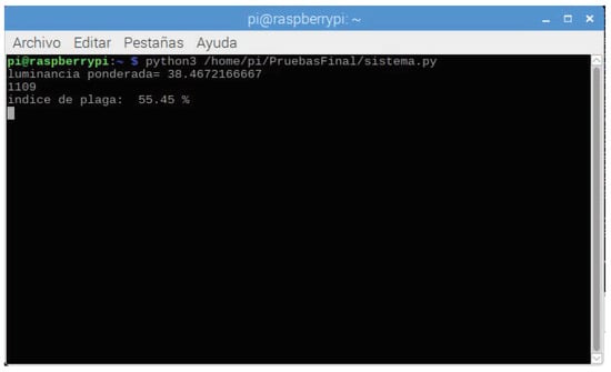 Finally, in this phase, the image is passed to a two-dimensional matrix to search for the white pixels representing the pest and calculate the crop’s pest affection factor. This factor is determined by scanning the image data matrix processed in the previous phase. The white pixel count indicates that approximately 2000 white pixels are 100% of the pest infestation on the plant, and 0% are the 0 pixels found. For example, Figure 7 shows a console printout of the data representing the processed images.