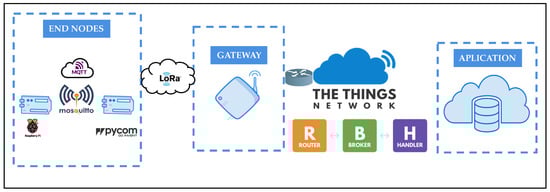 The TTN network is the IoT platform on which this work is developed. This TTN network defines the IoT cloud platform for the LoRa protocol. It allows low-power devices to use long-range gateways to connect to a decentralized network to exchange data with applications [54]. The communication architecture in the TTN platform is shown in Figure 8. In this architecture, Raspberry Pi and Lopy devices are networked using Wi-Fi technology, which enables the MQTT layer, and both are end nodes. Meanwhile, in the LoRaWAN protocol, the node sends a message to the base stations via the LoRa radio protocol. One or more gateways receive the messages from the node and transmit them to the application through a network server. The gateways are also connected to a router responsible for setting their status and scheduling transmissions. Thus, each router is connected to one or more Brokers, which identify the sender node and send the message to the correct application, and vice versa, i.e., they choose the gateway to which they should send the application download messages. On the other hand, a Handler manages the application data, which is encrypted and decrypted in the Handler. On the other hand, the network server takes care of the LoRaWAN-specific functions [42]. In other words, the node joins the network through Over-The-Air Activation (OTAA) [54] and sends data to the created application. The gateway receives LoRa messages, converts them into information packets, and sends them to the router. The router receives the messages from the gateways and looks for a Broker to send them to. The Broker identifies the node, de-duplicates the traffic, and sends the packet to the Handler, who will register the application. The Handler encrypts and decrypts the payloads and publishes messages for the applications to the Brokers. Finally, the application collects and interprets the data.