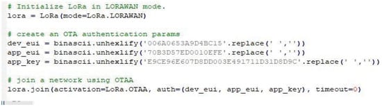 Working on the LoRa radio module of the microcontroller requires loading specific libraries such as MQTTclient, LoRa, and Pycom, and incorporating GitHub files [58]. These steps are key to configuring the LoRaWAN mode as a parameter for radio access and sending packets using LoRa modulation on the Europa 868 Mhz frequency. Also, the keys that the application generates are added to establish the OTAA connection, as shown in Figure 11.