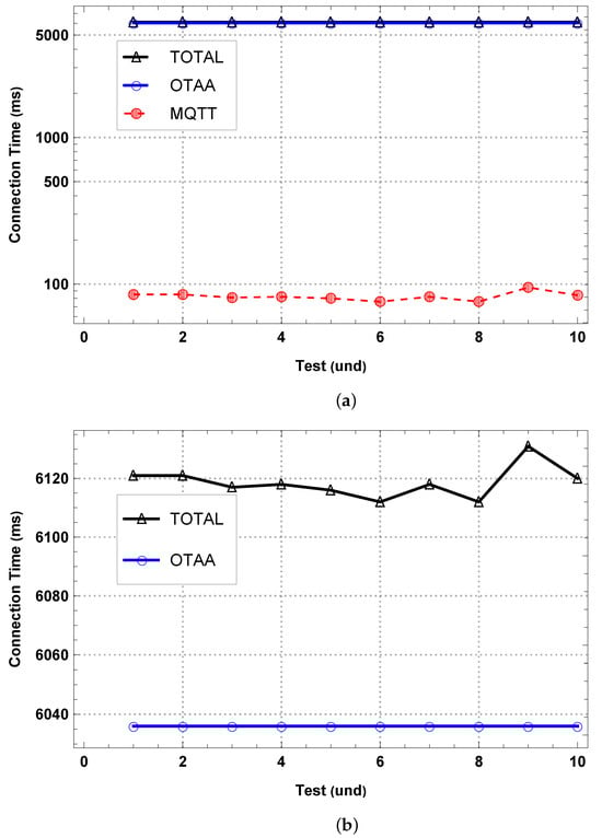 Connection time in each test. (a) TOTAL, OTAA and MQTT times. (b) TOTAL and OTAA times.
